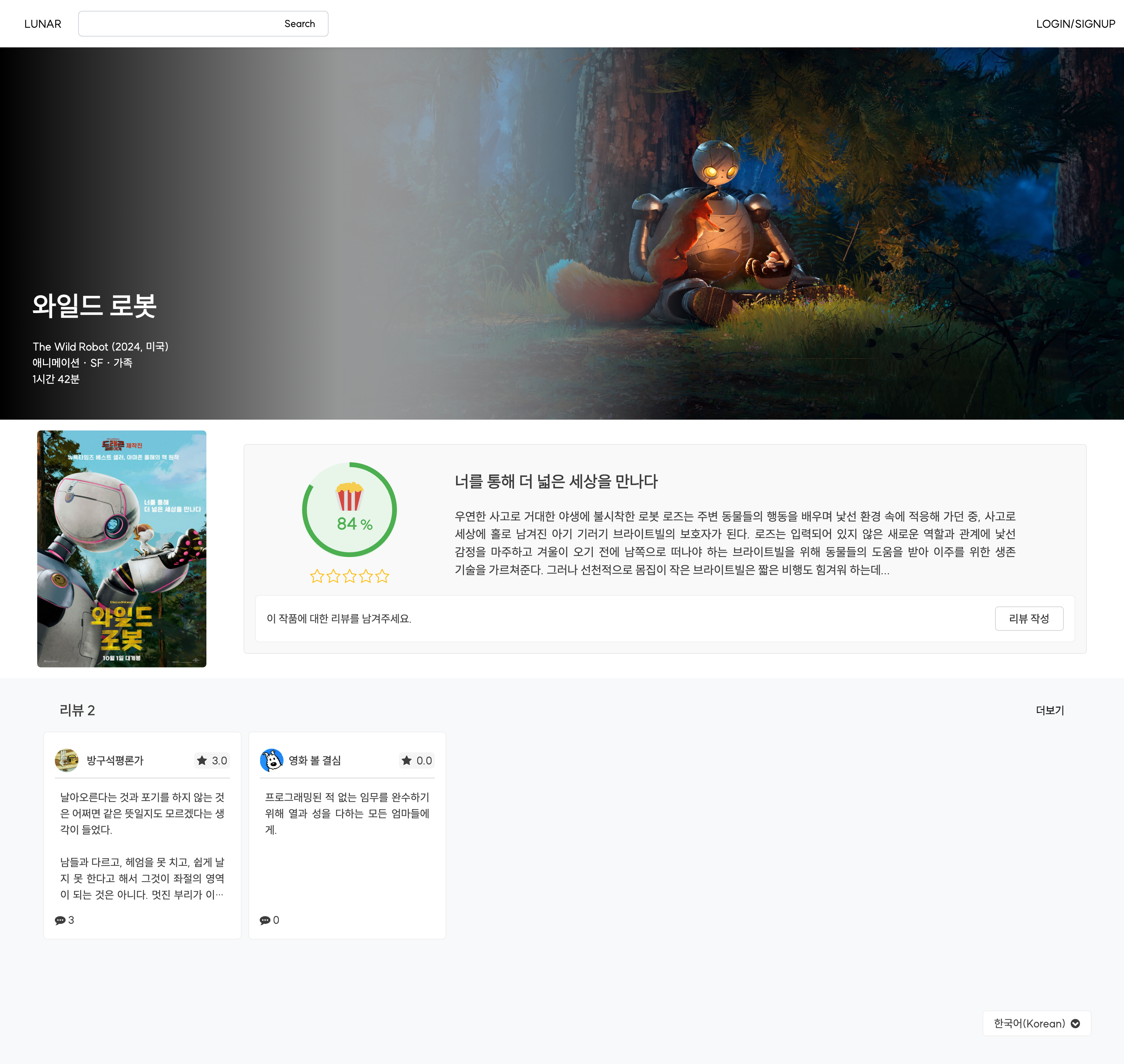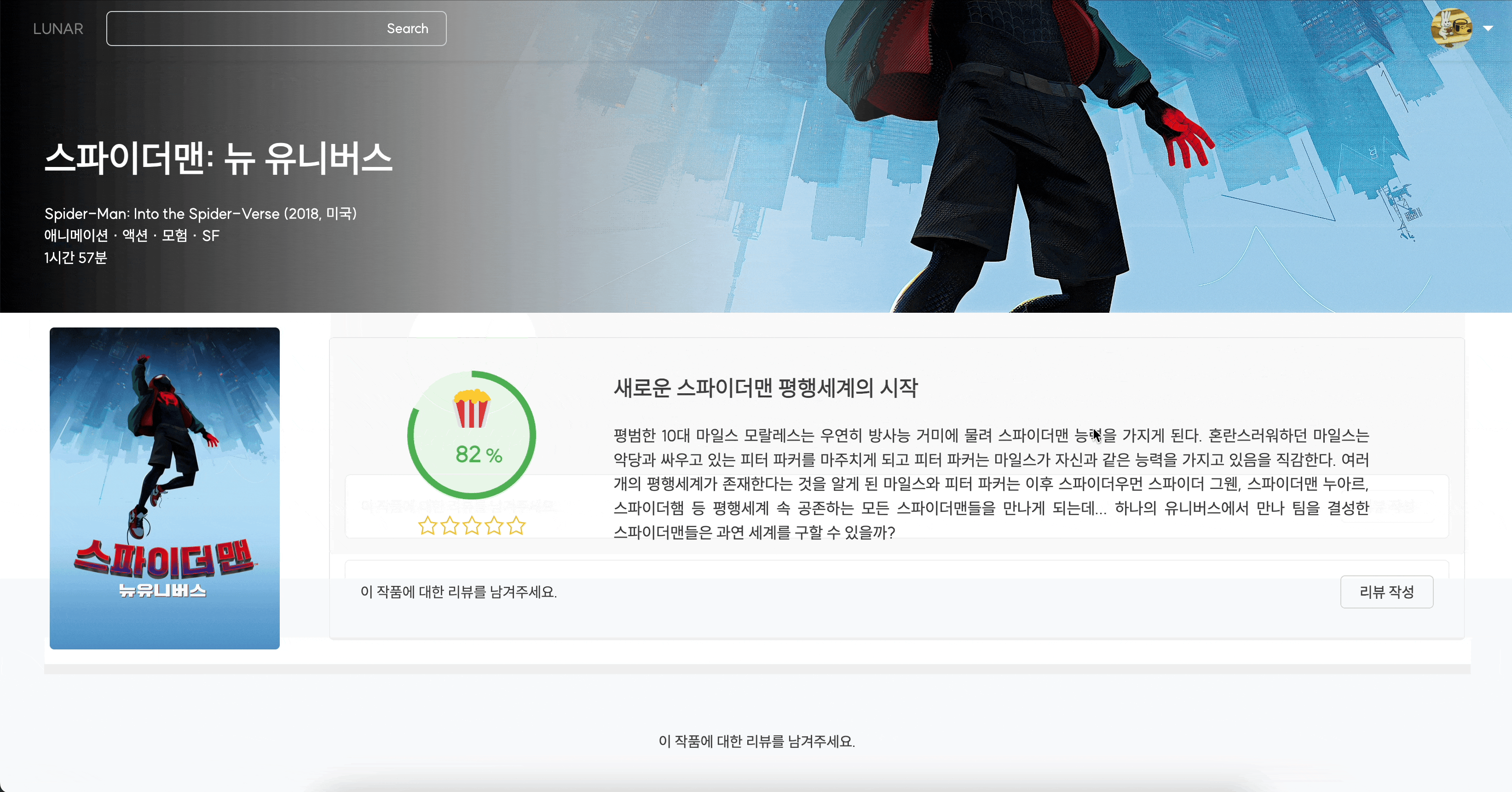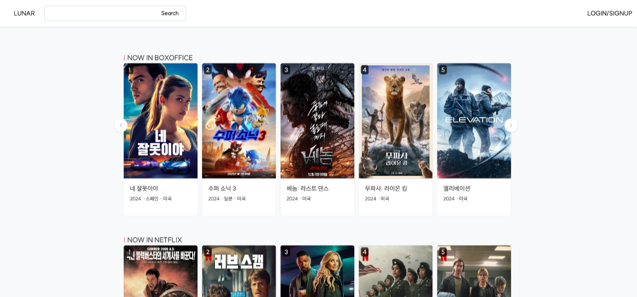 작년 이맘때 쯤 완성했던 개인 프로젝트 MovieHub를 리팩토링한 LUNAR 프로젝트를 소개합니다. 밤하늘을 밝게 비춰주어 세상의 다른 면을 보게 해주는 달빛처럼, 영화는 우리가 살아가는 익숙한 현실의 특별한 모습을 보게 해줍니다. LUNAR는 다양한 영화와 리뷰, 그리고 코멘트를 통해 새로운 달빛을 발견할 수 있는 플랫폼입니다. 영화를 사랑하는 사람들이 모여 감상을 공유하고 느꼈던 점을 기록할 수 있는 커뮤니티입니다.