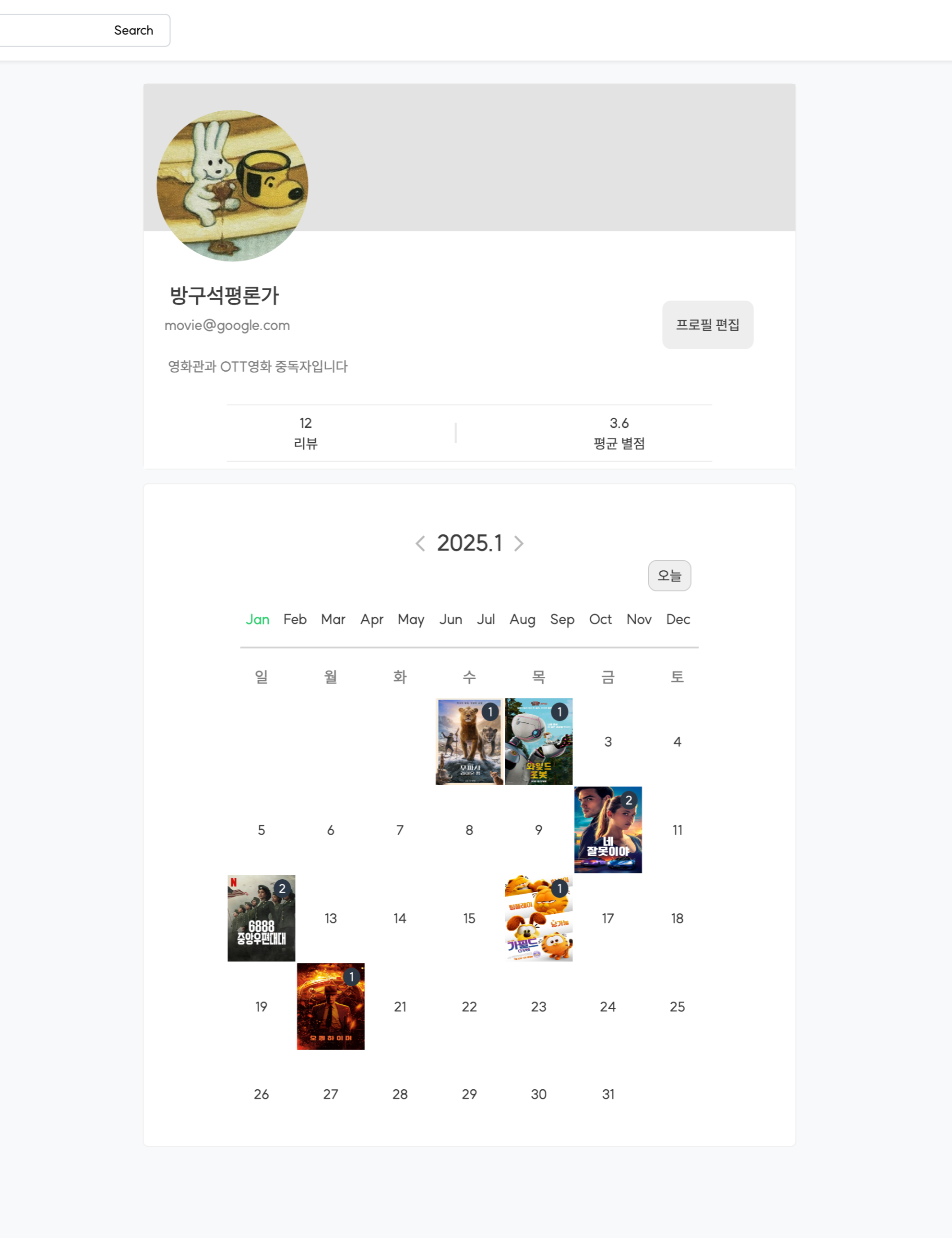 유저 페이지에 사용한 캘린더는 이전 MovieHub 프로젝트에서 사용했던 코드를 재사용하였습니다. 계산된 날짜 정보를 캘린더에 표시된 각 날짜와 비교하여, 사용자가 평가를 남긴 날짜가 캘린더에 해당하는 날짜와 일치하는지 확인합니다. 일치할 경우, 해당 날짜의 셀에 해당 영화의 포스터 이미지를 동적으로 삽입합니다.