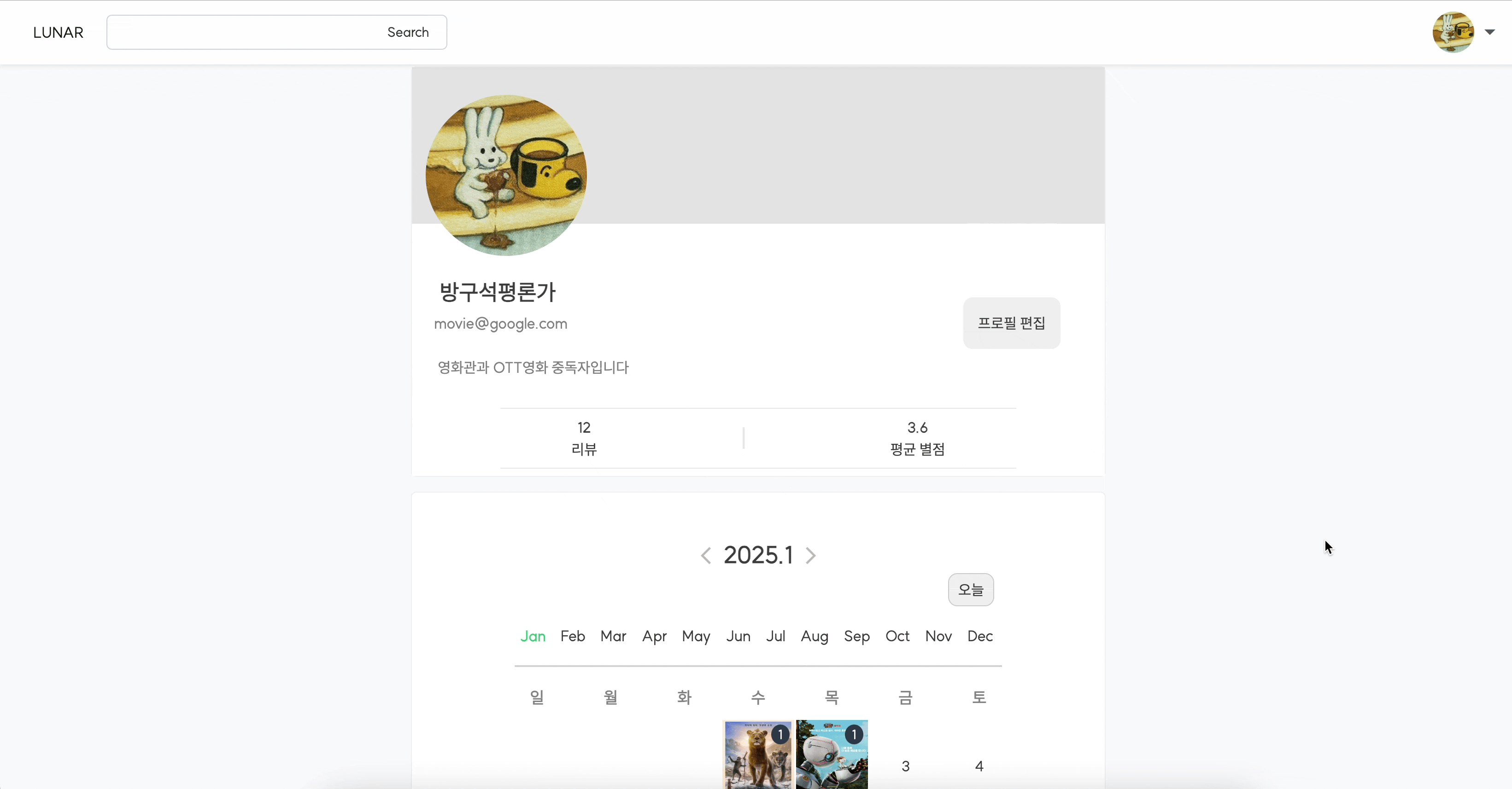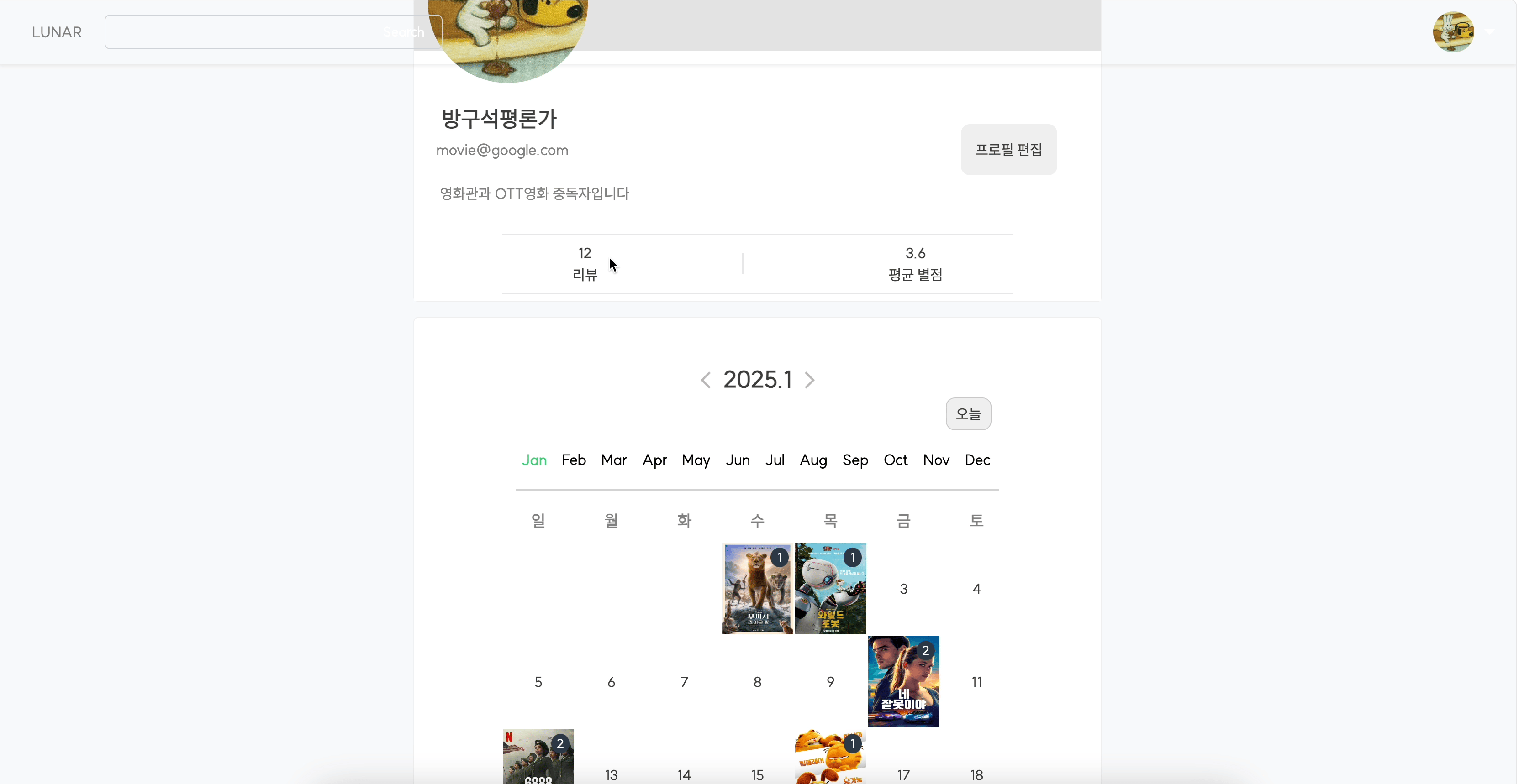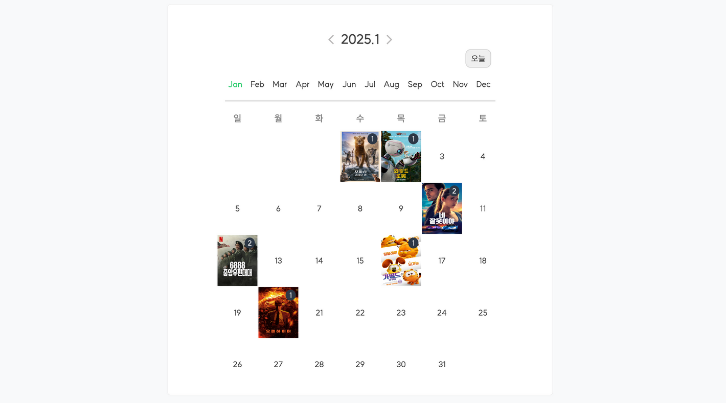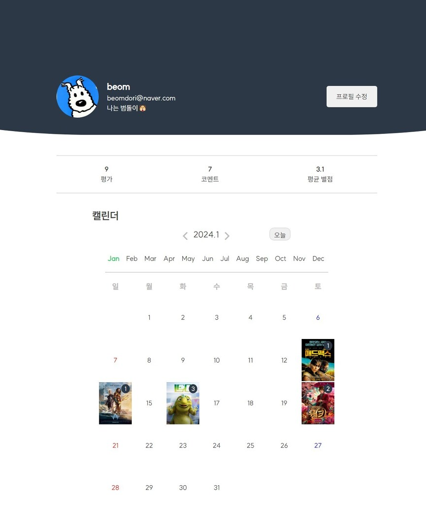 또한, 캘린더 기능은 기존에 작성했던 순수 JavaScript 캘린더를 그대로 사용하면서, 별점 평가를 한 날짜에 영화 포스터가 추가되도록 하여, 사용자가 월별로 자신의 영화 기록을 시각적으로 쉽게 확인할 수 있도록 개선했습니다. 이로써, 영화 평가 기록이 캘린더에 효과적으로 표시되어 보다 직관적이고 유용한 사용자 경험을 제공할 수 있게 되었습니다.