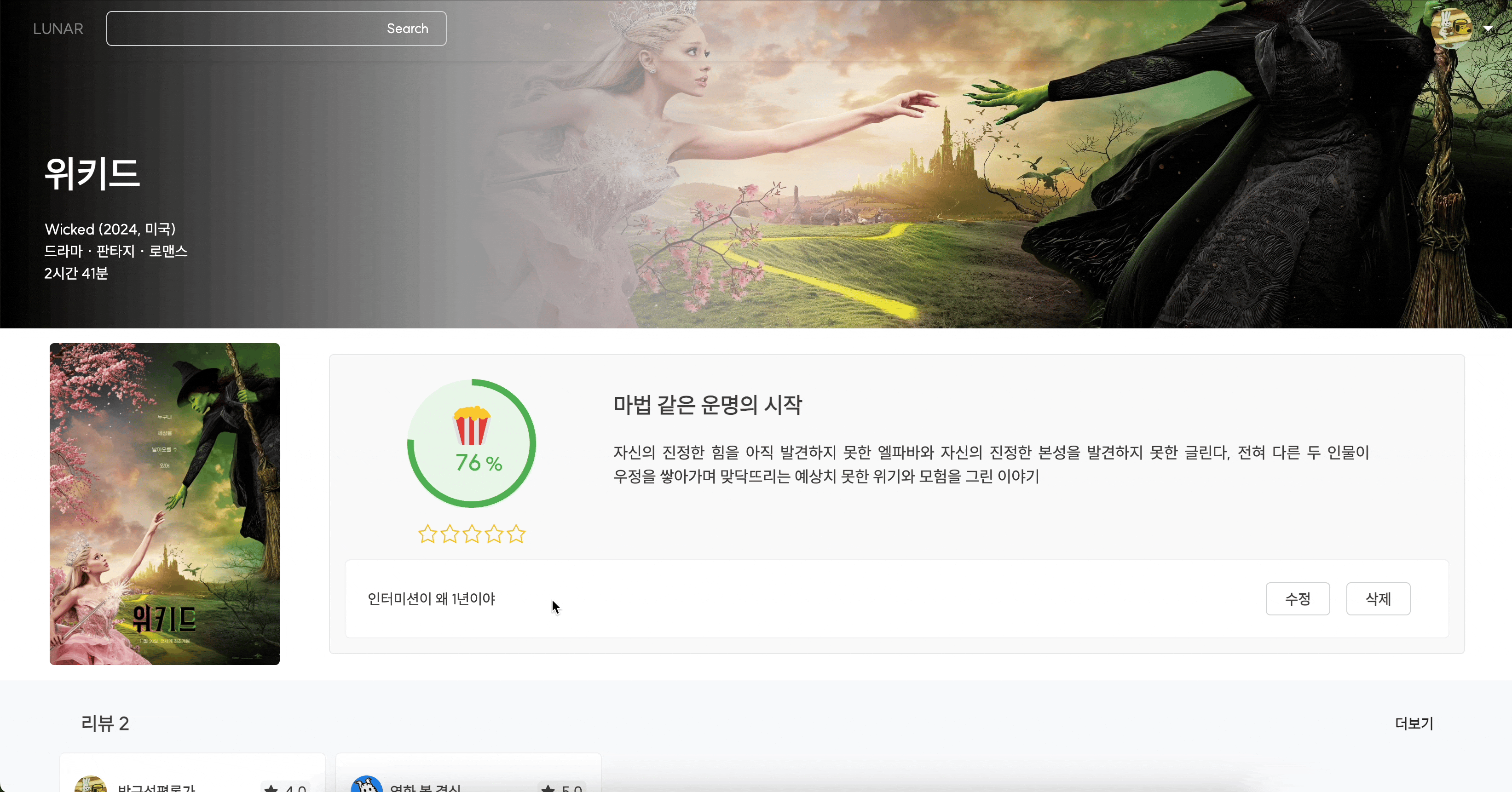 Lunar: 코멘트 페이지를 삭제하고 평가 페이지와 평점 페이지로 구분하여 리뷰와 평가를 중심으로 한 기능을 강조하는 구조로 변경하여 사용자들이 더 직관적이고 상세하게 영화 정보를 평가하고 기록할 수 있도록 하였습니다.