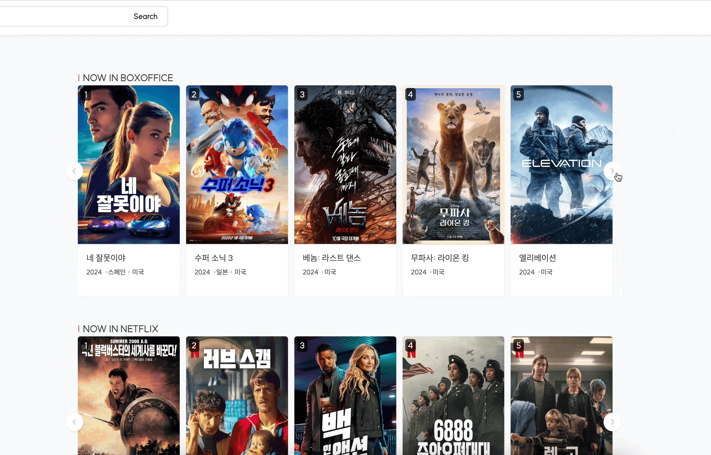 검색 기능을 공통 헤더로 분리하여 사용자들이 어느 페이지에서든 손쉽게 영화를 검색할 수 있도록 개선하였습니다. 이로 인해 검색의 접근성과 편의성이 대폭 향상되었습니다. 또한, 슬라이드 목록을 확장하여 더 많은 영화 콘텐츠를 제공함으로써 사용자들이 다양한 영화를 탐색할 수 있도록 했습니다. 이와 함께, 페이지의 오른쪽 하단에 다국어 기능을 추가하여 사용자가 원하는 언어로 애플리케이션을 즉시 변경할 수 있도록 구현, 글로벌 사용자 경험을 강화하였습니다.
