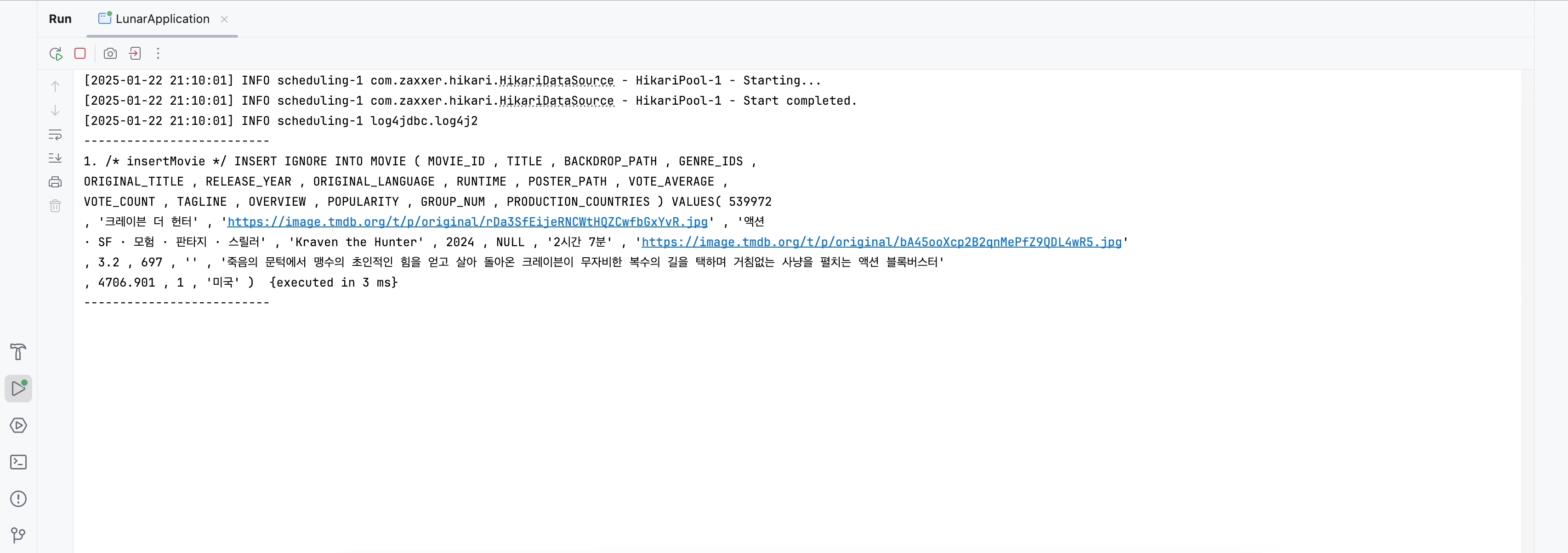 최신 데이터를 유지하기 위해 스케줄링 기능을 적용하여 매일 오후 3시에 자동으로 영화 정보를 업데이트하도록 설정했습니다. 이 스케줄링은 Spring Framework에서 제공하는 스케줄러 어노테이션(@Scheduled)을 활용하여 구현되었으며, 이를 통해 별도의 관리자 개입 없이 데이터베이스에 최신 정보를 주기적으로 갱신할 수 있도록 자동화했습니다.